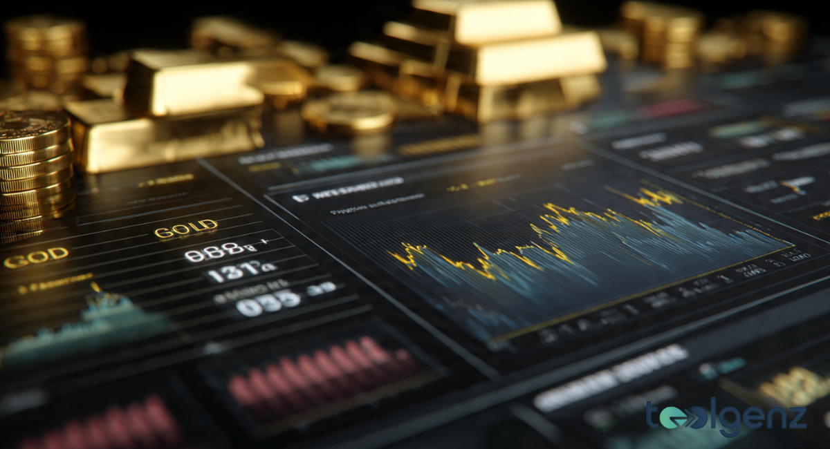 A digital financial dashboard displaying real-time candle charts and market data alongside stacks of heavy, lustrous yellow bars and coins.
