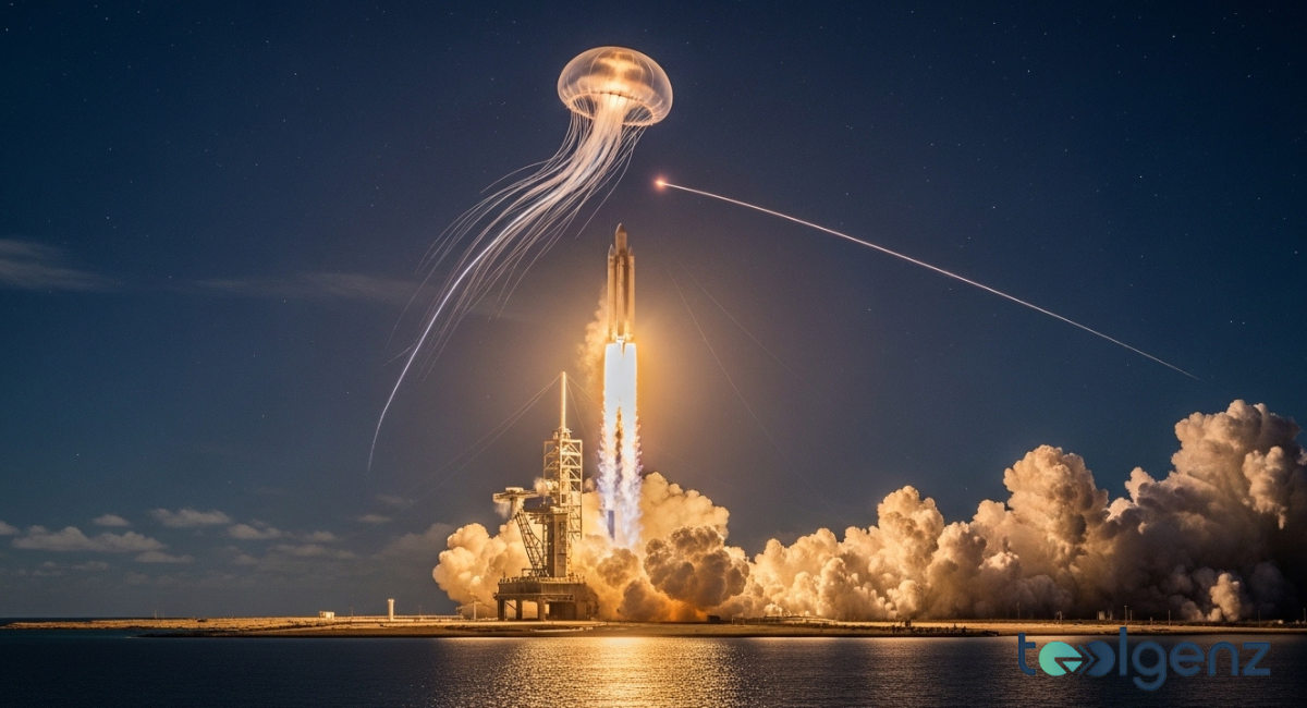 During this SpaceX rocket launch, spectators witnessed the so-called “space jellyfish” effect. The phenomenon occurs when a rocket climbs high enough to catch sunlight while the ground below is still in darkness. As the exhaust plume expands in the upper atmosphere, sunlight illuminates it from above, creating a glowing, translucent shape that appears to float across the sky.